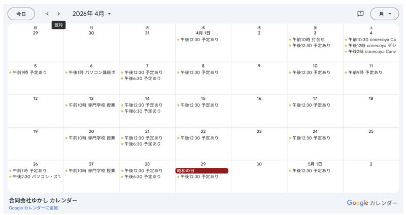 Googleカレンダーを使って、2026年4月からの会社としての予定を公開することにしました。