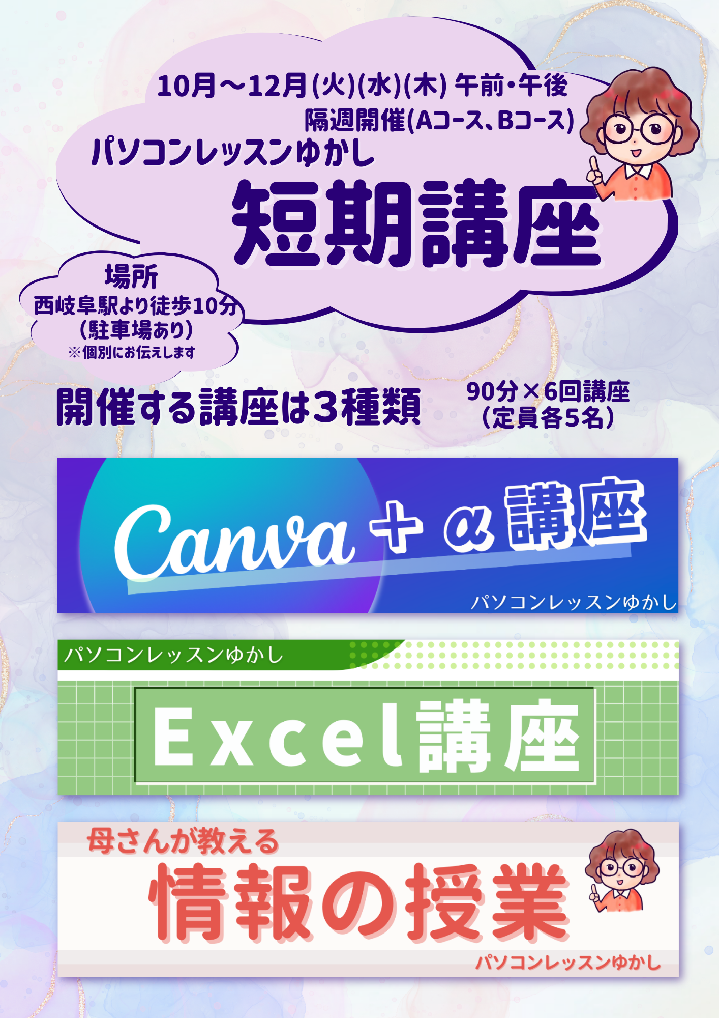 ![]() ![]() 2025/10月~12月 開催 短期講座 JR西岐阜駅近くの会場で開催した講座です |