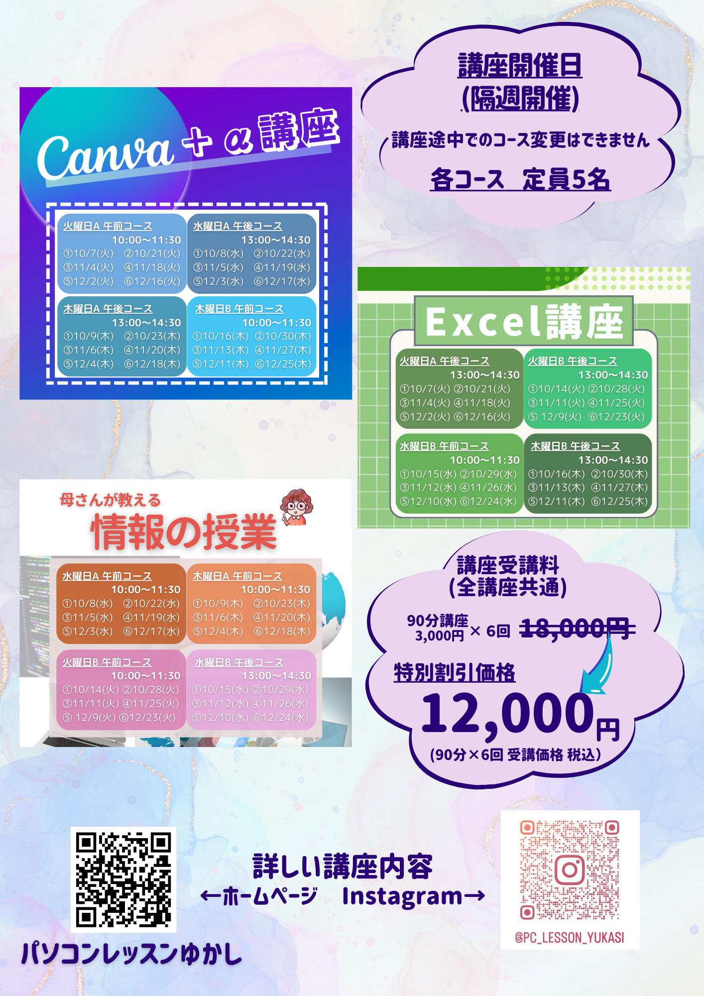 ![]() 2024/8/21、2025/1/9、1/13、2/7 開催 Canva講座 話題のCanva。どんなアプリなのか、無料と有料で出来ることの違いを知り、実際にCanvaの画面を使って体験を行います ※スマホ・タブレット・パソコンをお持ちください(Canvaアプリは入っていなくてもOKです) (90分講座 受講料3,000円 テキストはありません) |